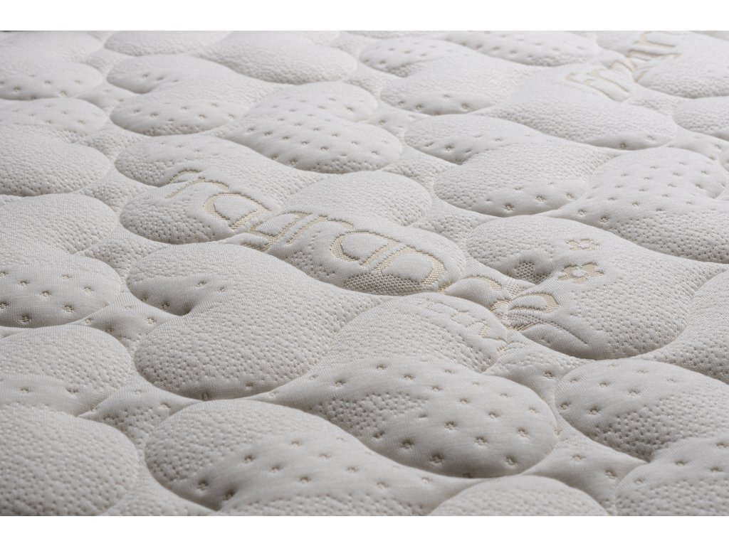 Príjemný elastický poťah z látky FRAGRANCE LEMON krémovo-zlatý, prešívaný do tvaru srdiečok, je snímateľný s 2 zipsami ozdobenými zlatými výpustkami, na bokoch s 3D lemom v bielej farbe pre dokonalé odvetranie matraca. Celková výška matraca 22 cm. Antiroztočový a hypoalergénny.